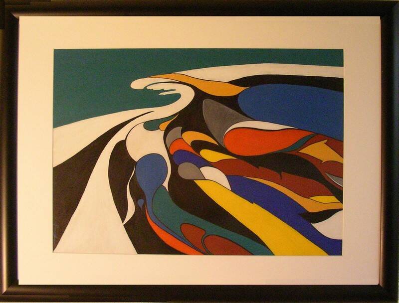 acrylverf op papier; ingelijst; hoogte 90cm; breedte 66cm.