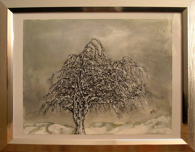 Pentekening met acrylverf op papier; ingelijst; hoogte 30cm; breedte 40cm.