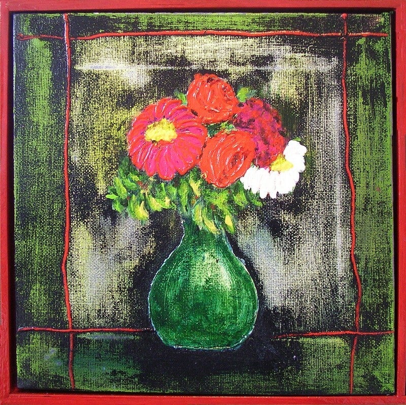 Acrylverf op doek, ingelijst; hoogte 25cm; breedte 25cm.